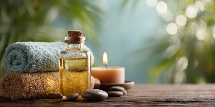 Serene spa setting featuring essential oil bottle, rolled towels, lit candle, and smooth stones on wooden table with a calm green background
