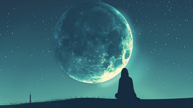 Crescent moon, hanging low in a clear night sky. Muslim person in thoughtful contemplation.