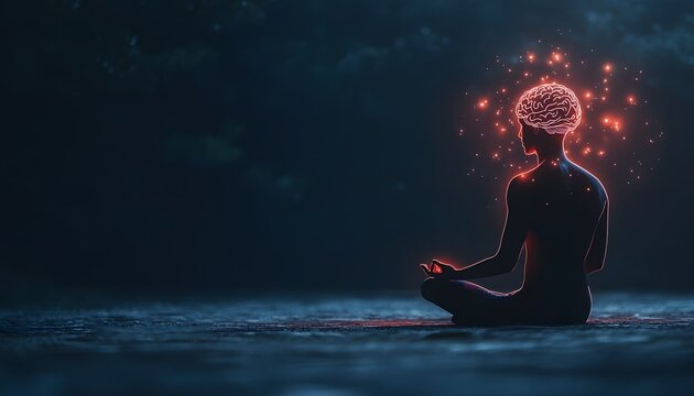 Abstract representation of meditation with glowing brain concept, highlighting the connection between mind, body, and spirituality in a serene environment