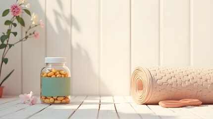 Wellness Scene with Pill Bottle, Yoga Mat, and Flowers