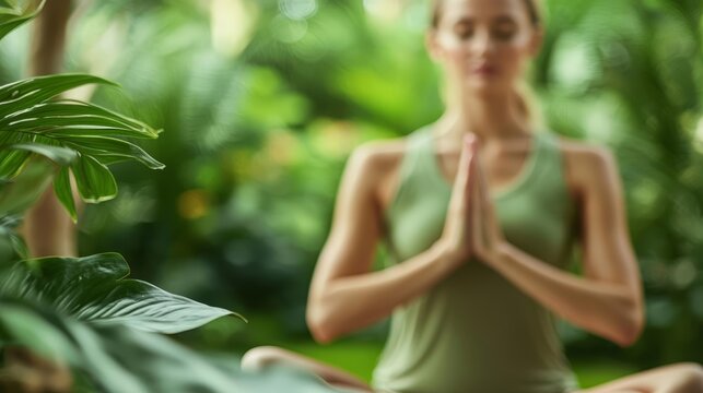 Serene woman meditating in tranquil park, embracing mindfulness