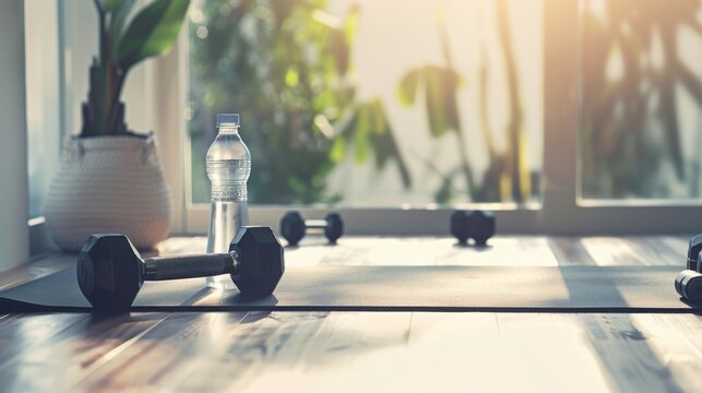 A serene image of a yoga mat with a pair of dumbbells and a bottle of water, set in a home gym with soft, natural light streaming through the window
