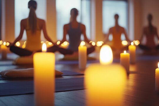 Participants engage in a calming yoga class surrounded by flickering candles in a dimly lit studio. The emphasis on relaxation promotes mindfulness and inner peace during the session