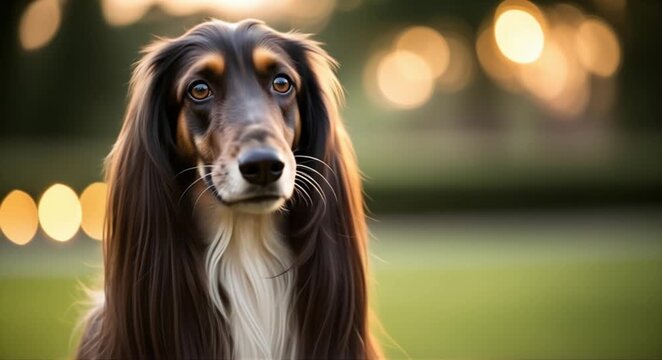 Elegant Afghan Hound with long flowing hair looks serenely at the camera in a park at sunset