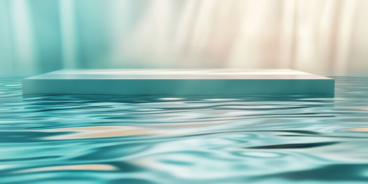 A water-inspired 3D background featuring a podium emerging from a tranquil, reflective pool. Gentle ripples and subtle light refractions add a sense of serenity and elegance, making it ideal for