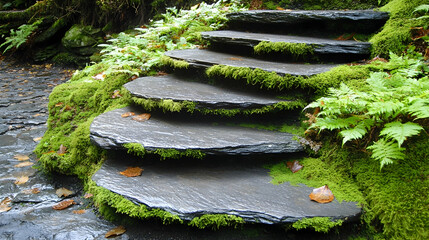 Mossy stone steps in a lush garden path. Serene nature background ideal for relaxation or spa promotion