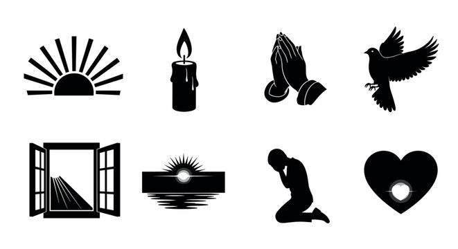 Black silhouette icons depicting a sunrise, lit candle, praying hands, flying dove, open window, sun over water, kneeling person in prayer, and a heart with a light.