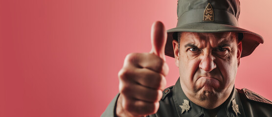 Drill sergeant or instructor, man in military uniform, showing reluctantly approving thumb up. Banner empty copy space on side. Generative AI