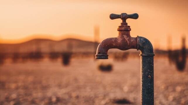 Serious global issue concept. Rusty faucet against a blurred sunset landscape, evoking a sense of nostalgia and decay.