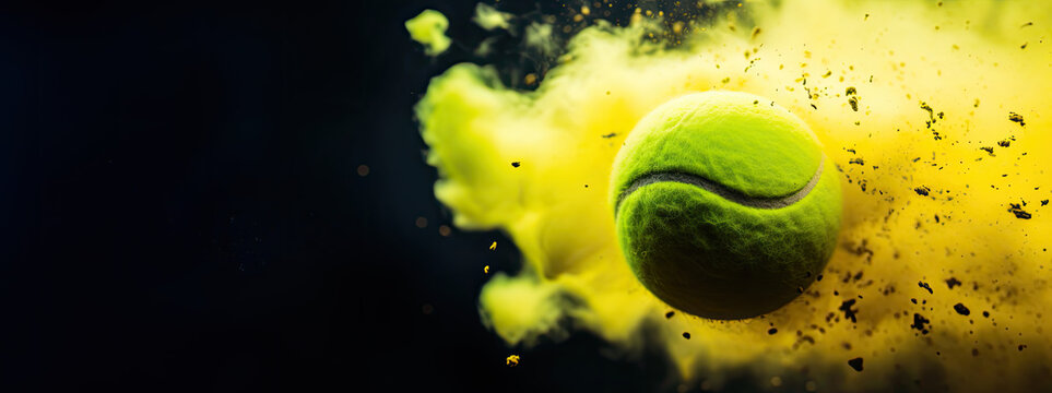 tennis ball flying through the air with an explosion of bright yellow smoke in front of a black background, tennis sport concept in panorama, design banner for your text