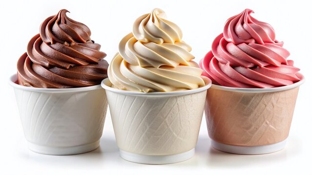 Collection of soft serve ice cream swirl in plastic cups on white background. Frozen yogurt with vanilla, strawberry, chocolate flavor. Mock up template no label for sundae ice cream dessert menu.