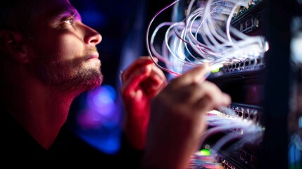 Data Center Technician Maintaining Server Equipment in Advanced Technology Environment with Neon Lighting