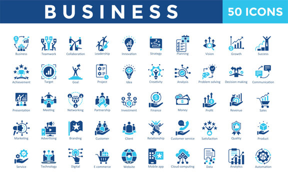 Business icon set with teamwork, collaboration, leadership, innovation, strategy, planning, vision, growth, success icon. Simple flat vector
