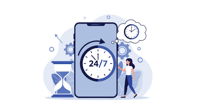 Concept of 24/7 service and support, showing a woman with a smartphone displaying a clock, an hourglass, and gear icons.