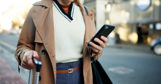 Woman, phone and hands with luggage in street to travel with taxi app, transport and commute in city. Professional, person and smartphone for cab location, trip details and ride service on sidewalk