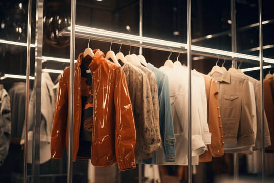 A row of clothes hanging on a rack. This image can be used to depict a clothing store, laundry service, or fashion industry