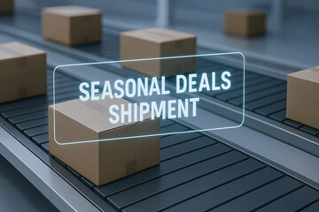 Seasonal deals shipment packages on conveyor belt in warehouse with cardboard box moving through distribution center conveying efficient logistics and delivery service
