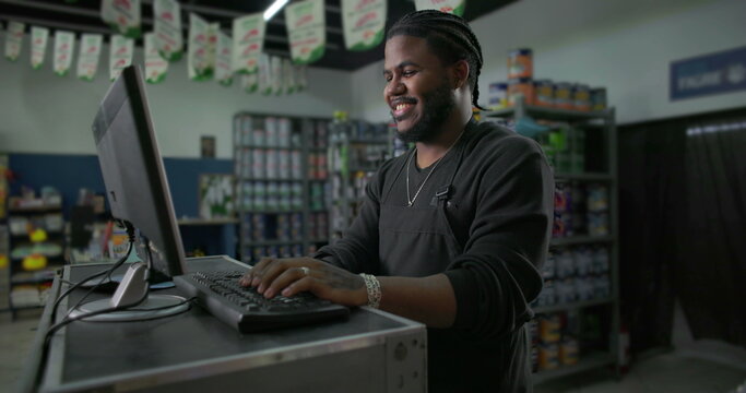 Smiling young man working at a computer in a paint store, engaging with customers and managing inventory, representing professionalism and friendly service in retail