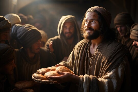 The benevolence of Jesus Christ: providing bread for the poor, a timeless gesture of compassion and empathy, reflecting the teachings of humility and service in christian tradition.