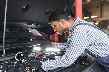 latin hispanic auto mechanic in uniform is examining a car while working in auto service