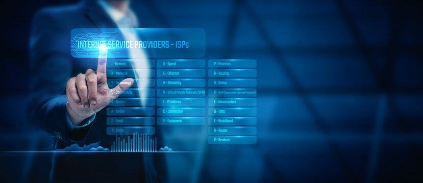 Businessman touch the internet service provider (ISP) industry, searching for reliable and efficient network services. Digital technology advancements in the ISP sector support.