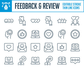 Feedback, Testimonials and Review thin line icons. Customer service and Client satisfaction outline icon set. Editable stroke icons.