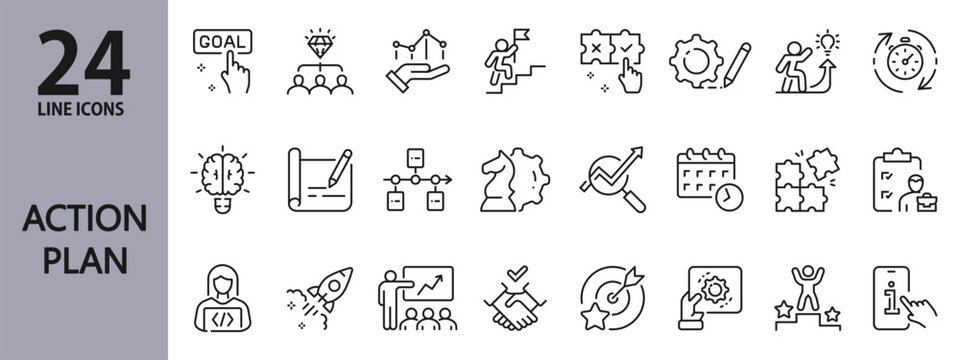 Action Plan line icons set with Strategy, Growth, Business, Goal, Meeting, Success, Teamwork, Management, Career, Planning and more. Editable Stroke