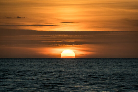 Sun sets amid light clouds in the Gulf of Mexico.