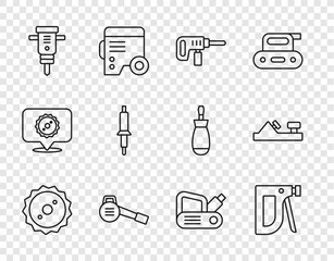 Set line Circular saw blade, Construction stapler, Electric drill machine, Leaf garden blower, jackhammer, Soldering iron, planer tool and Wood icon. Vector