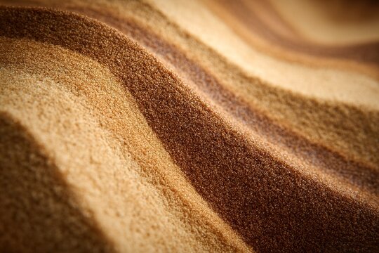 Patterns formed by layers of brown and beige sand in a close-up view, highlighting texture and colors at midday in a studio setting
