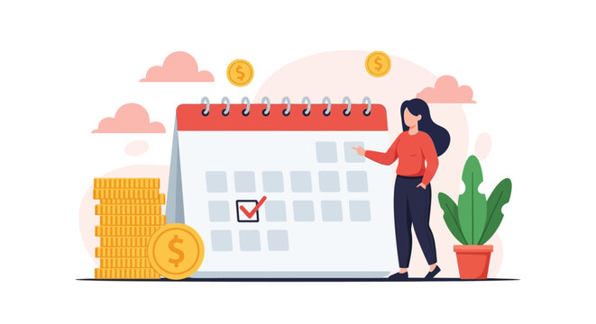 Managing finances with a calendar and coin stacks for financial planning, setting reminders, and reaching monetary goals.