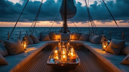 A boat with a table full of candles and pillows