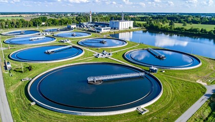 Aerial view of a modern wastewater treatment plant with circular settling tanks and surrounding green landscape