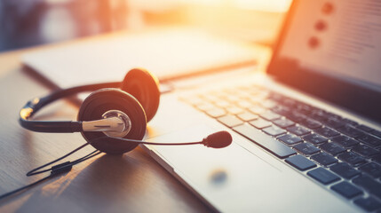 Office setup with headset on notebook and glowing laptop with chat windows symbolizing organized positive customer support culture