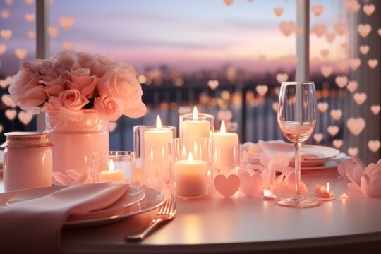 Valentine dinner setup mockup with romantic pastel-colored lights