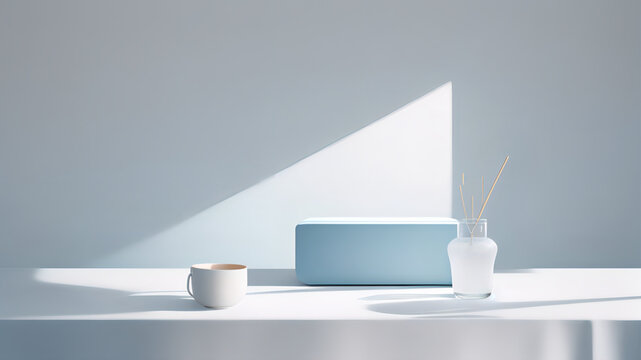 Product Photography & Presentation on Blue and White Cube Podium, Enhanced by Pastel Light Blue Minimal Wall Scene