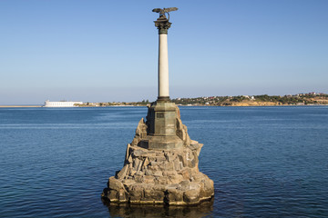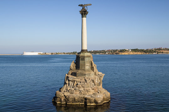 Monument to the Scuttled Ships in Sevastopol. The inscription reads In memory of the ships sunk in 1854-1855 to block the entrance to the raid
