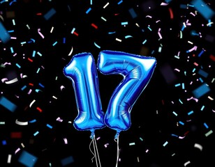 Festive illustration for birthday anniversary celebration. Blue foil balloons shaped as number seventeen against black background filled with colorful confetti. Perfect for invitations cards party