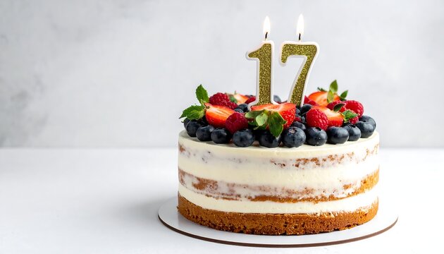 Seventeenth Birthday Cake with Strawberries, Raspberries, and Blueberries, A Festive Cake Celebrating Seventeen Years with Fresh Berries and Glittering Candles