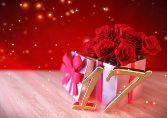 birthday concept with red roses in gift on wooden desk. 17th. 3D render