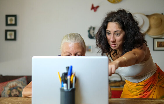 Computer lesson within the walls of the house for mother and daughter. The two women are seventy and thirty-eight years old respectively and are of Caucasian origin