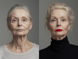 A 70 year old woman wearing a black casual shirt with a gray background presents a realistic style portrait of a modern elderly woman.