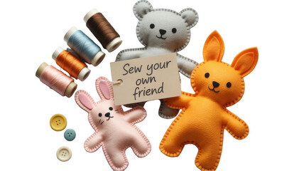 Colorful sewing kit including felt teddy bear and bunnies, spools of thread in various colors, and buttons, arranged on a transparent background, perfect for diy and craft projects
