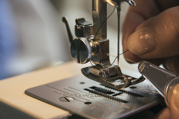 Retro sewing items: tailoring scissors, cutting knife, thimble, wooden thread spools, cushion for including pins, fabrics and sewing accessories.
