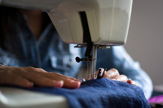 Sewing. Recycling Made by hand from home. sewing machine  project quarantine, lockdown. home sewing,Hobby, meditation,zero waste,recycling. Girl sews clothes home  sewing machine, ecology zero waste