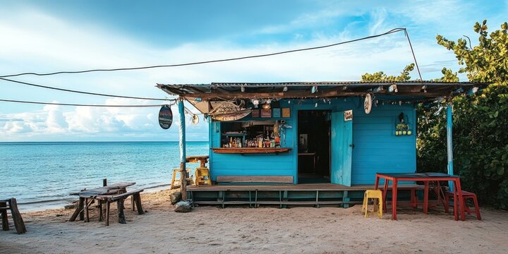 Vibrant surfboards lined up by rustic beach shack under sunny skies. Concept Beach Vibes, Surfing Culture, Sunny Day, Colorful Surfboards, Rustic Beach Shack