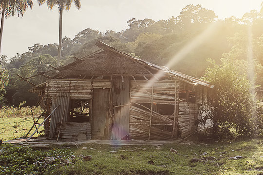 An old dilapidated shack with a patched corrugated metal roof boardedup windows and a smoking chimney.