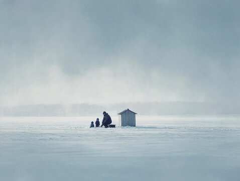 Serene winter scene featuring a father and children ice fishing near a small shack on a frozen lake under a cloudy sky. Evokes themes of family, nature, and solitude.