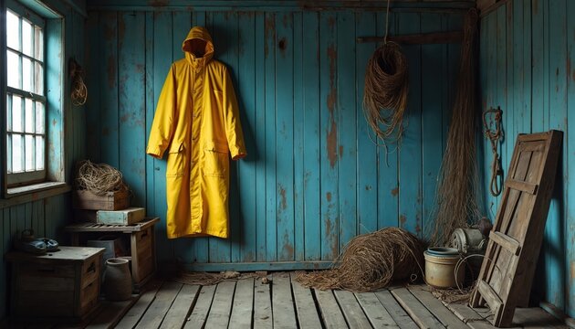 Interior view of rustic shack with fishing equipment on weathered wood wall, floor. Yellow raincoat hanging, fishnets, boxes scattered. Vintage nautical decor details. Seaside home background