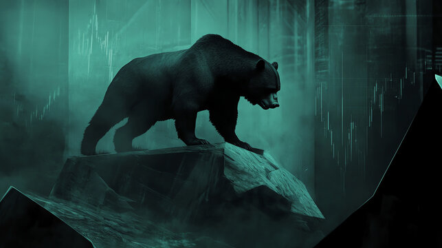 A bear in a powerful stance over a bull lying on a descending stock chart, with a dramatic, shadowy abstract business background conveying the severity of the economic crisis